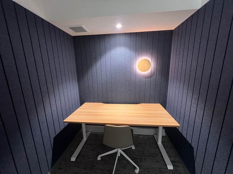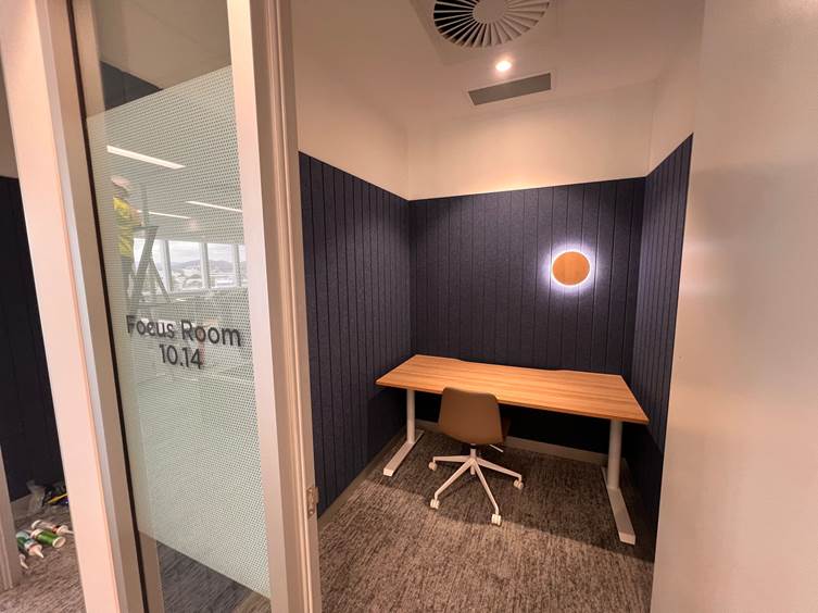 The completed meeting and focus rooms now offer a calm, acoustically balanced environment that supports speech intelligibility, user comfort, and workplace productivity. The Autex panels enhanced both function and form, contributing to a space that feels polished and purpose-built.